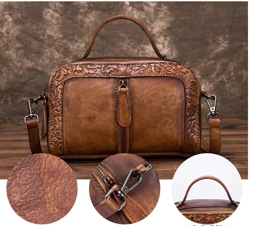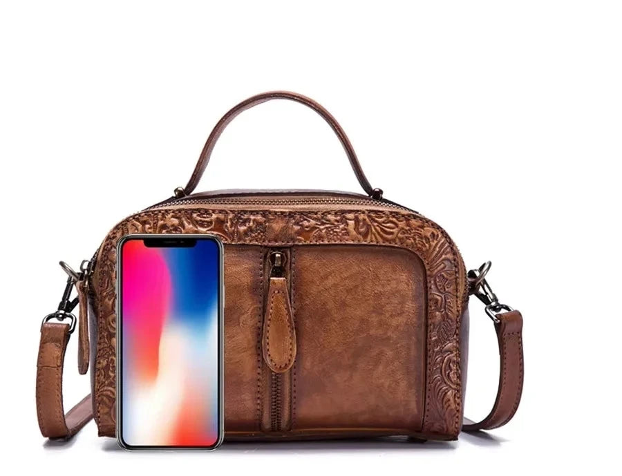 A Mala Alba Vintage da Lusitanna combina elegância contemporânea com um toque artístico. Produzida em couro genuíno de primeira camada, apresenta um acabamento em relevo sofisticado com detalhe pintado à mão, tornando cada peça única.