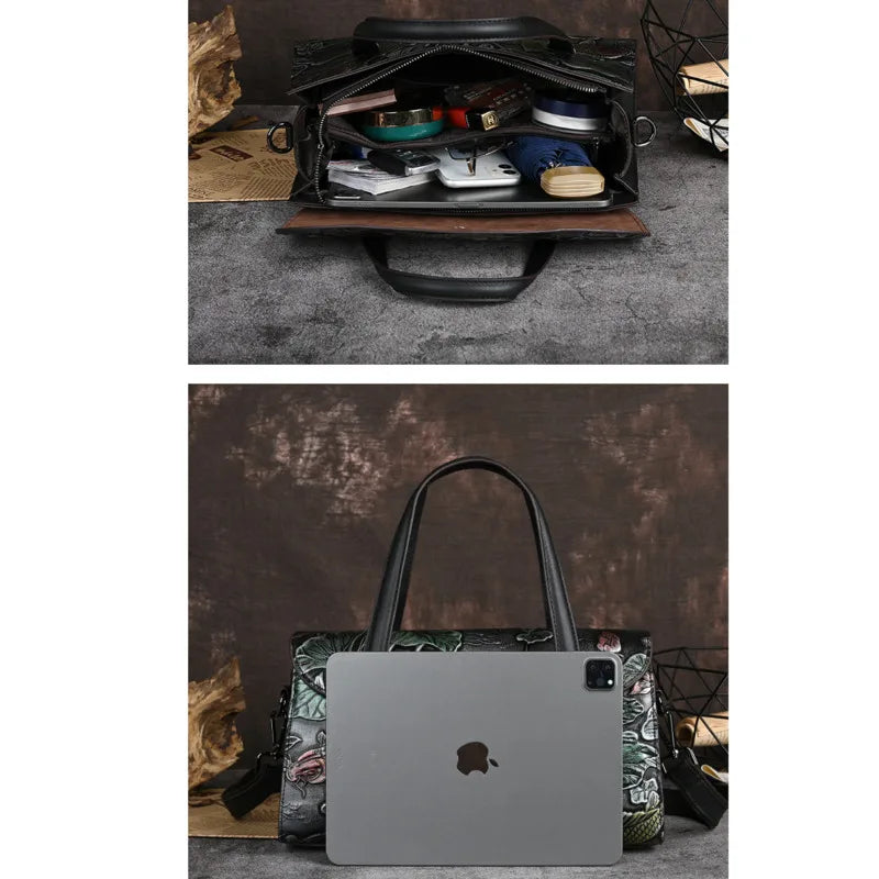 A Mala Jade Oriental Vintage da Lusitanna combina inspiração oriental com um design clássico e feminino. Produzida em couro genuíno de primeira camada, destaca-se pelo delicado relevo floral e pelo formato elegante estilo Boston.